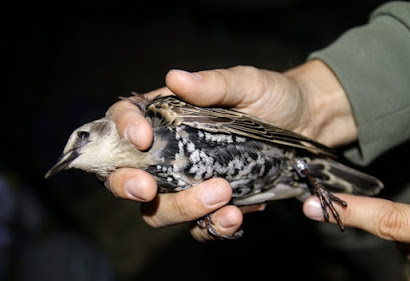 W tym czasie jestem przy namiocie, na nogach mam sandałki. Pobiegłam za głosem kota szpaków, do sieci dotarłam pierwsza. Moim oczom ukazał się straszny widok - ok. 20 szpaków w 2 sieciach wróblaczych. Był to obraz nędzy i rozpaczy. Szpaki wrzeszczały, płakały i darły się. Po kilku sekundach dotarło do mnie, że drą nie tylko się, ale i sieci. Niektóre, jak torpedy, po prostu przelatywały przez sieci zostawiając po sobie wielką dziurę. Inne, zaplątane w sieć rozrywały ją silnymi skrzydłami i uciekały. Dobiega Hania. Obie trzymamy w ręce po szpaku. Nie mamy worków, czekamy na resztę załogi. W międzyczasie patrzymy, jak szpaki masakrują sieć i nasze uszy. Zostało 10 szpaków. Dobiega reszta. Dobiegają worki. Zostało 7 szpaków - po 1 na załoganta.
